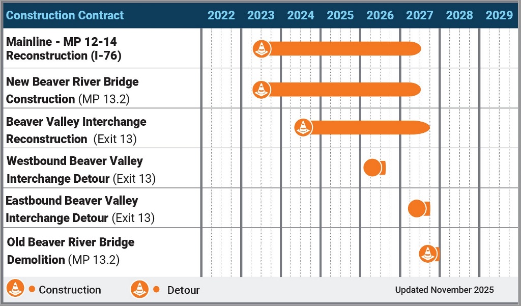 As part of this multiphase project, the PA Turnpike has advanced four overhead bridge replacements in the Milepost 12‑14 corridor. The Beaver River mainline bridge (WB‑211) replacement is currently under construction. Construction of the mainline roadway and the bridges over the Beaver River are currently in progress with an expected completion date of December 2027.