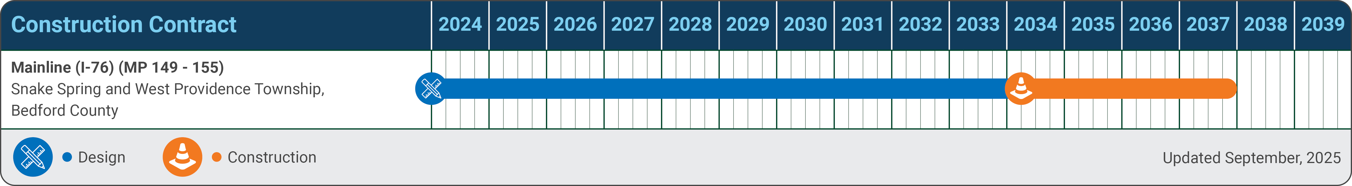 This project will reconstruct and widen six miles of the Pennsylvania Turnpike from Milepost 149 to Milepost 155 in Snake Spring and West Providence Townships, Bedford County. The roadway will be widened from four lanes to six lanes, featuring three 12-foot-wide travel lanes in each direction, a 26-foot median, and 12-foot-wide shoulders.