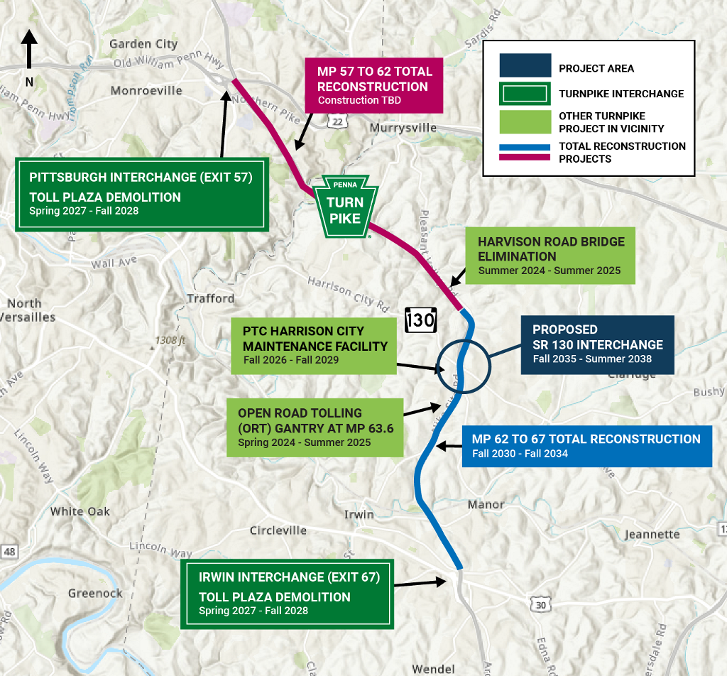 The project also involves replacing mainline bridges over local roads, lengthening culverts, and improving stormwater drainage through the area. As part of this multi-phase project, the PA Turnpike has advanced Trafford Road Bridge overhead bridge replacements at SR 4033 and Harvison Road Bridge (Milepost 61.68) has been removed.