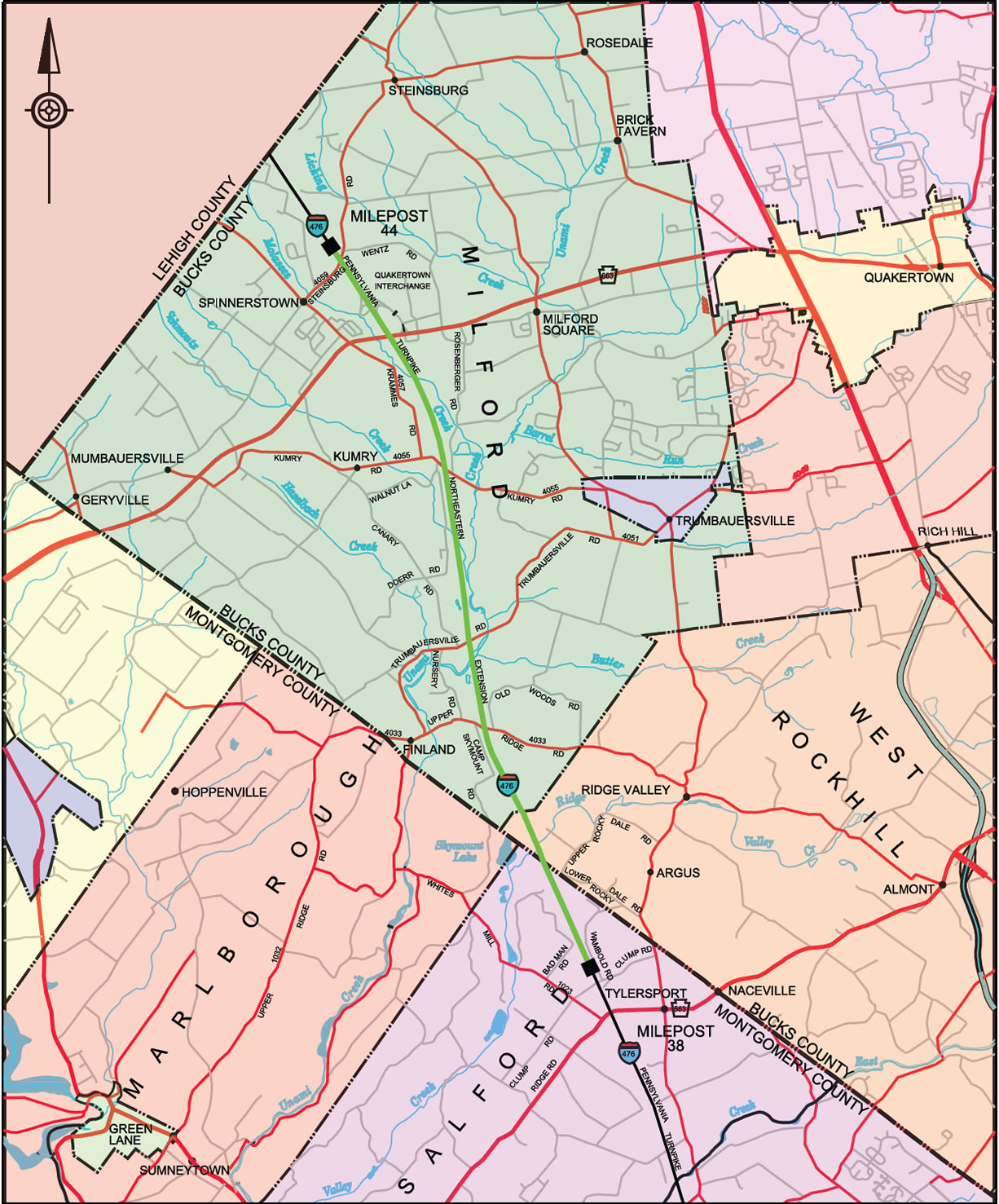 Final Design began in 2014 for the total reconstruction and widening of the Pennsylvania Turnpike's Northeastern Extension (I-476) north of Clump Road (milepost A38) to north of Steinsburg Road (milepost A44.5). The existing four-lane highway (74' wide) will be reconstructed to accommodate six 12-foot travel lanes with 12-foot left and right shoulders and 2' median barrier (122' wide). The project will also include the reconstruction of the Quakertown Interchange and the removal and replacement of five mainline bridges. The project corridor traverses Salford Township in Montgomery County and West Rockhill and Milford Townships in Bucks County.